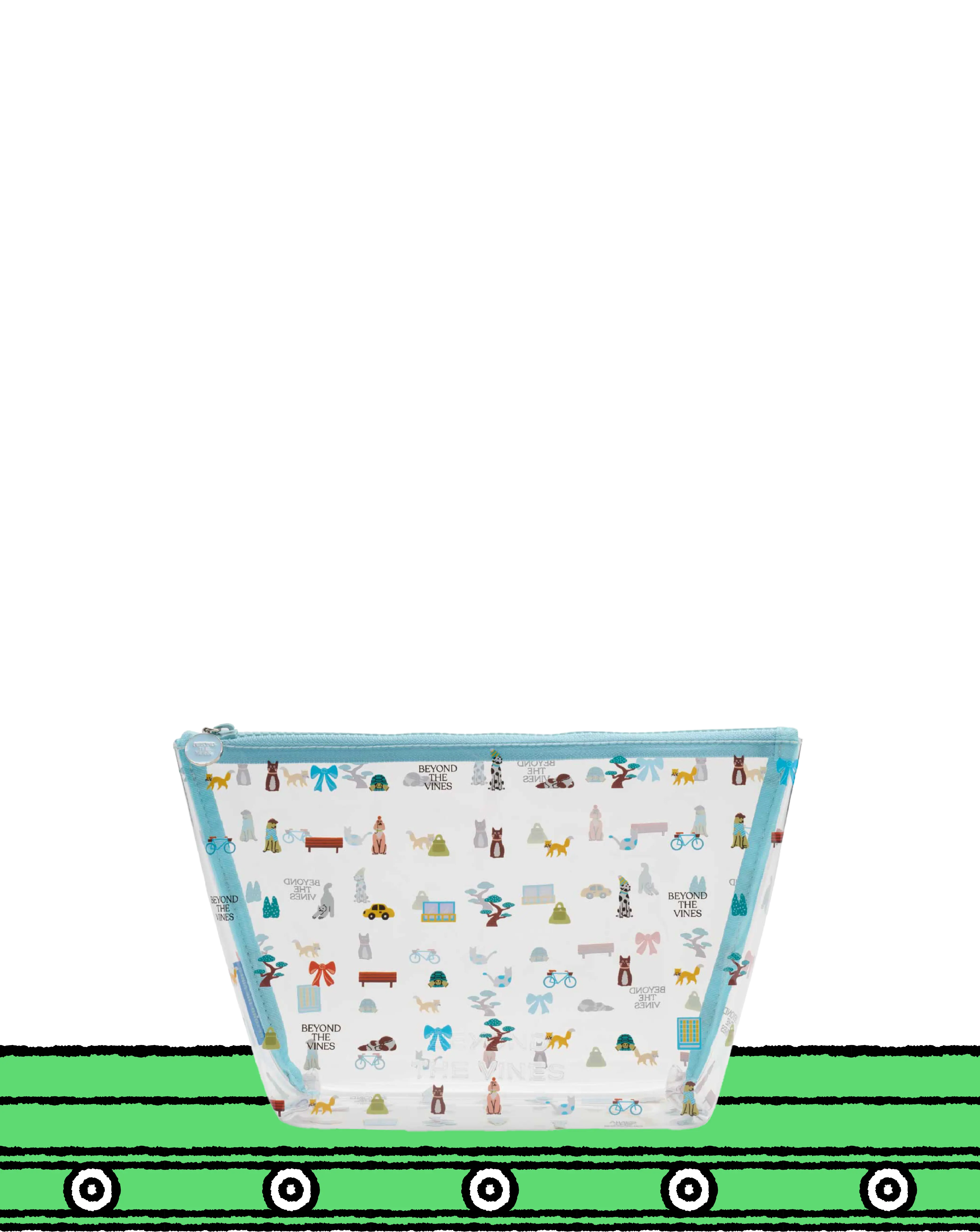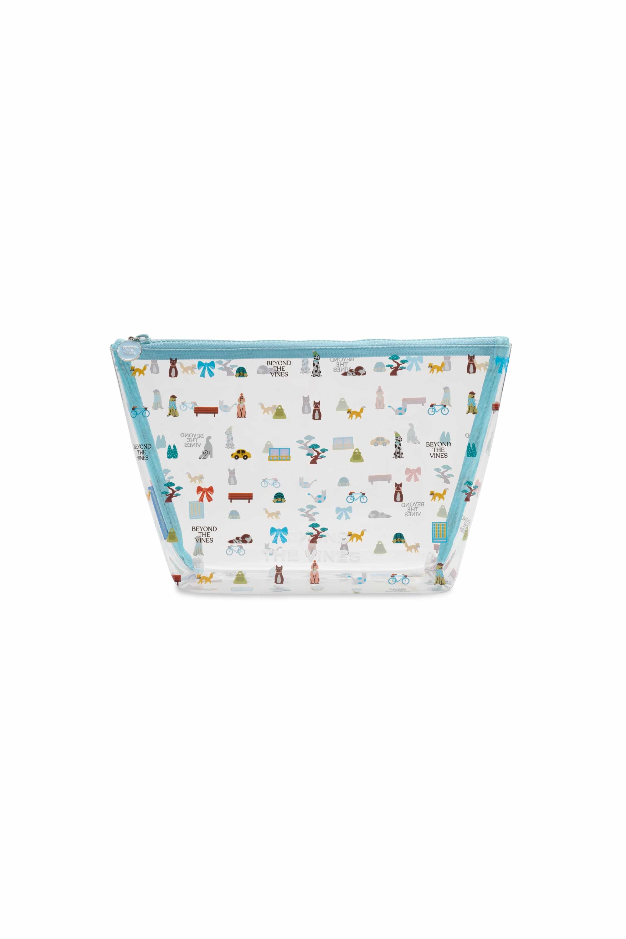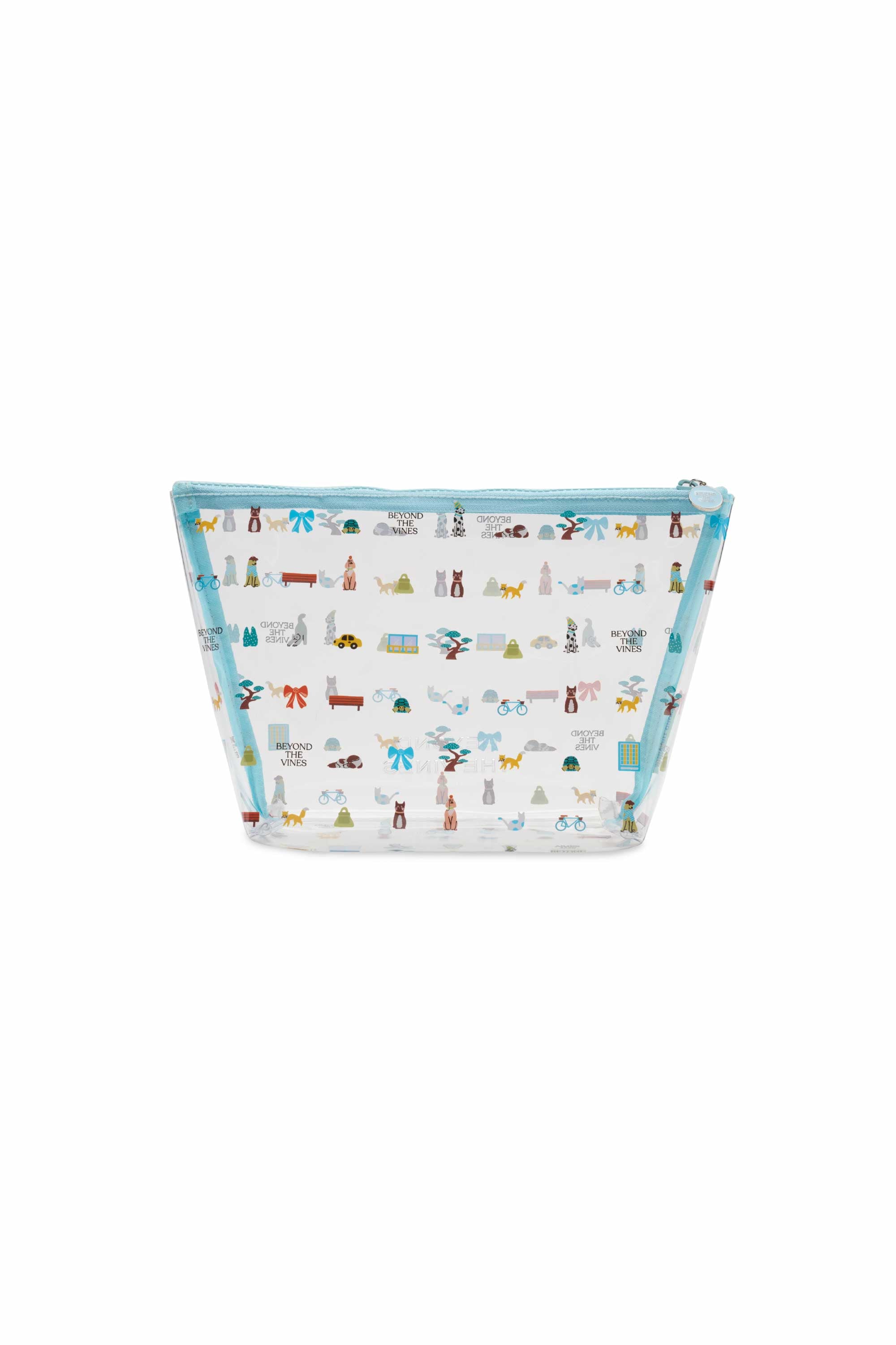 Designed with our Beyond Boulevard graphic and a contrast zipper, this clear PVC pouch has a rectangular silhouette and is the perfect add on to contain your travel items. It is finished with the brand logo embossed on the front.