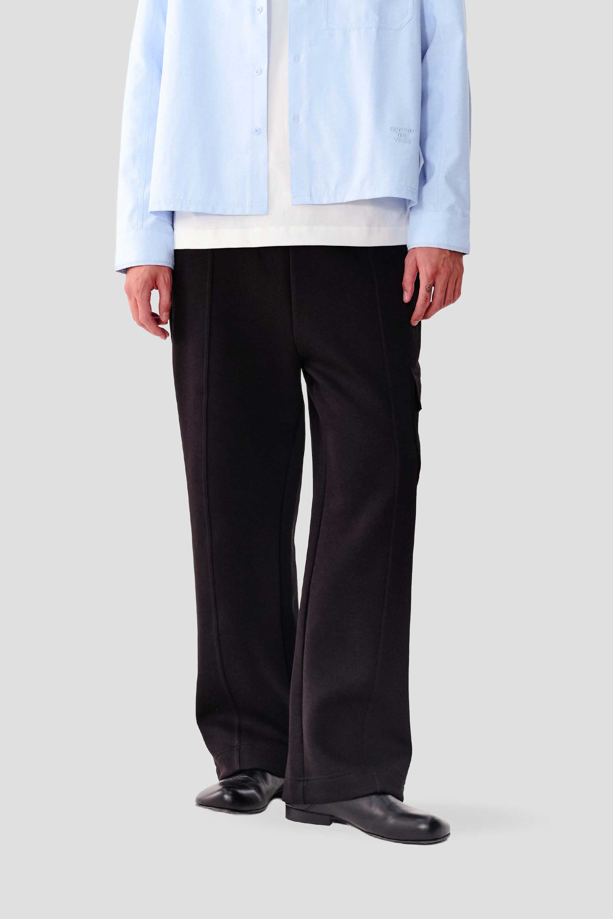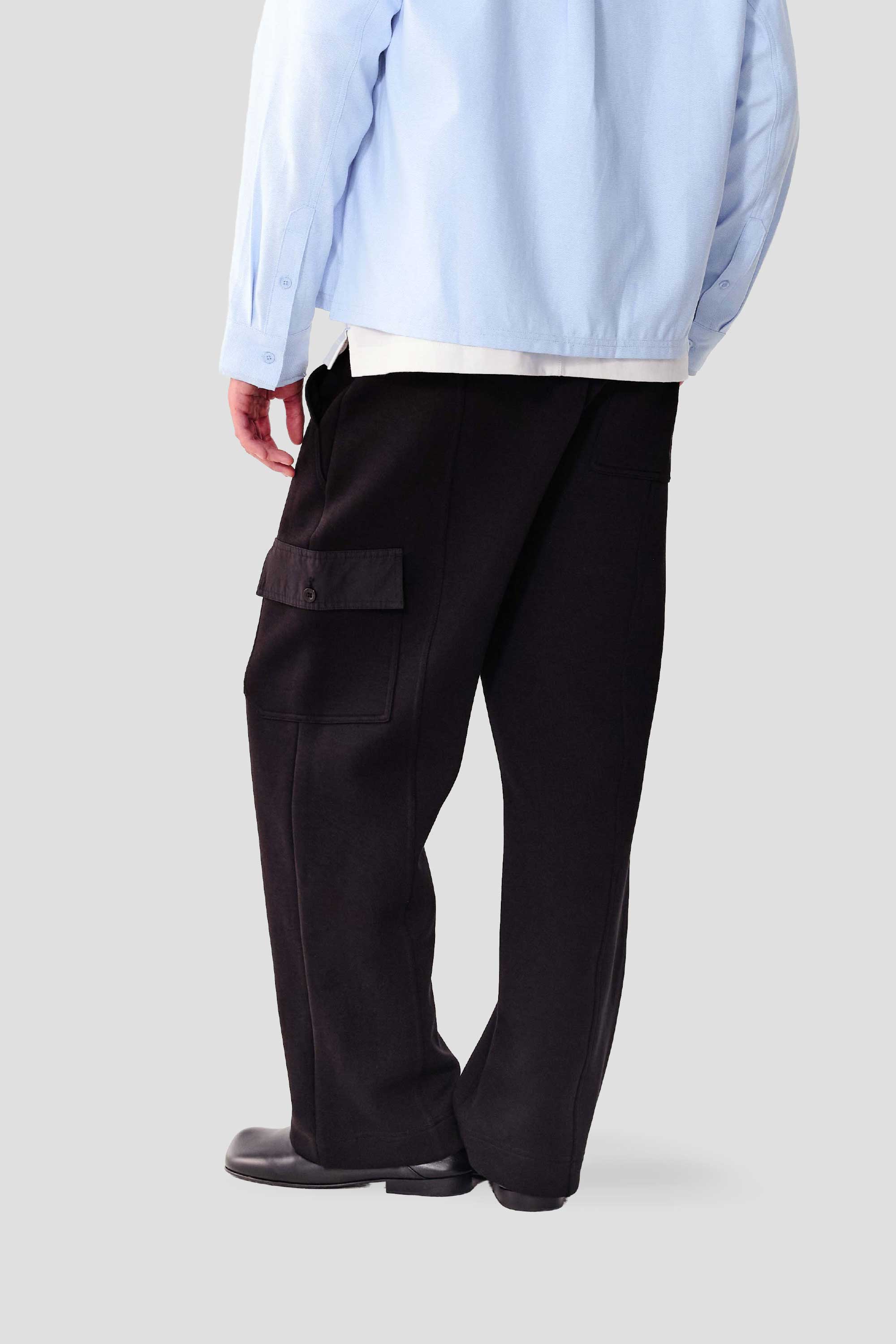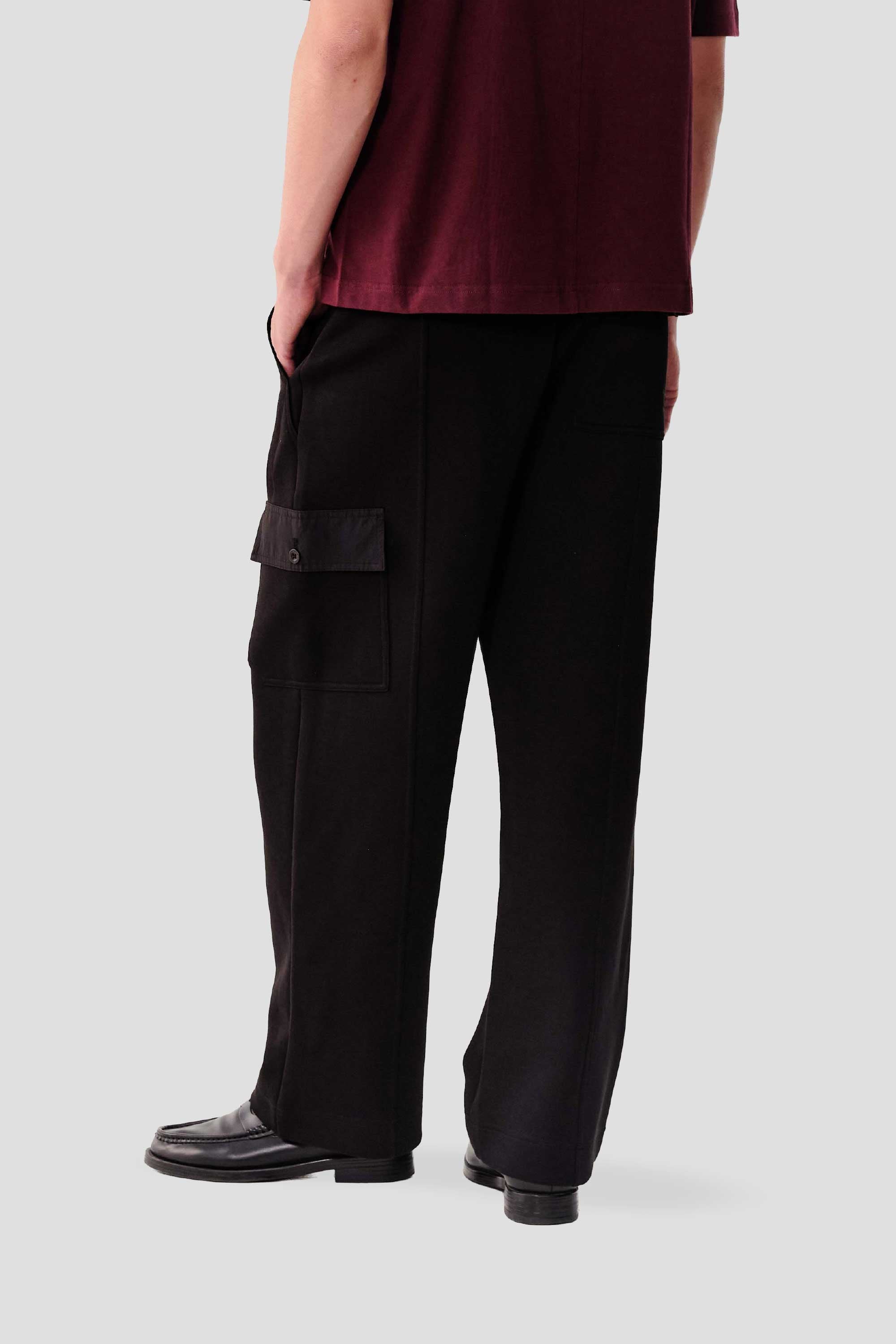 These jersey cargo trousers feature a relaxed, straight-cut silhouette with centre leg seams. Slanted side pockets provide easy access, while patch pockets on the left leg and back are finished with tonal nylon flaps. An elasticated waistband with an internal drawstring offers adjustable comfort, complemented by an understated embroidered logo.